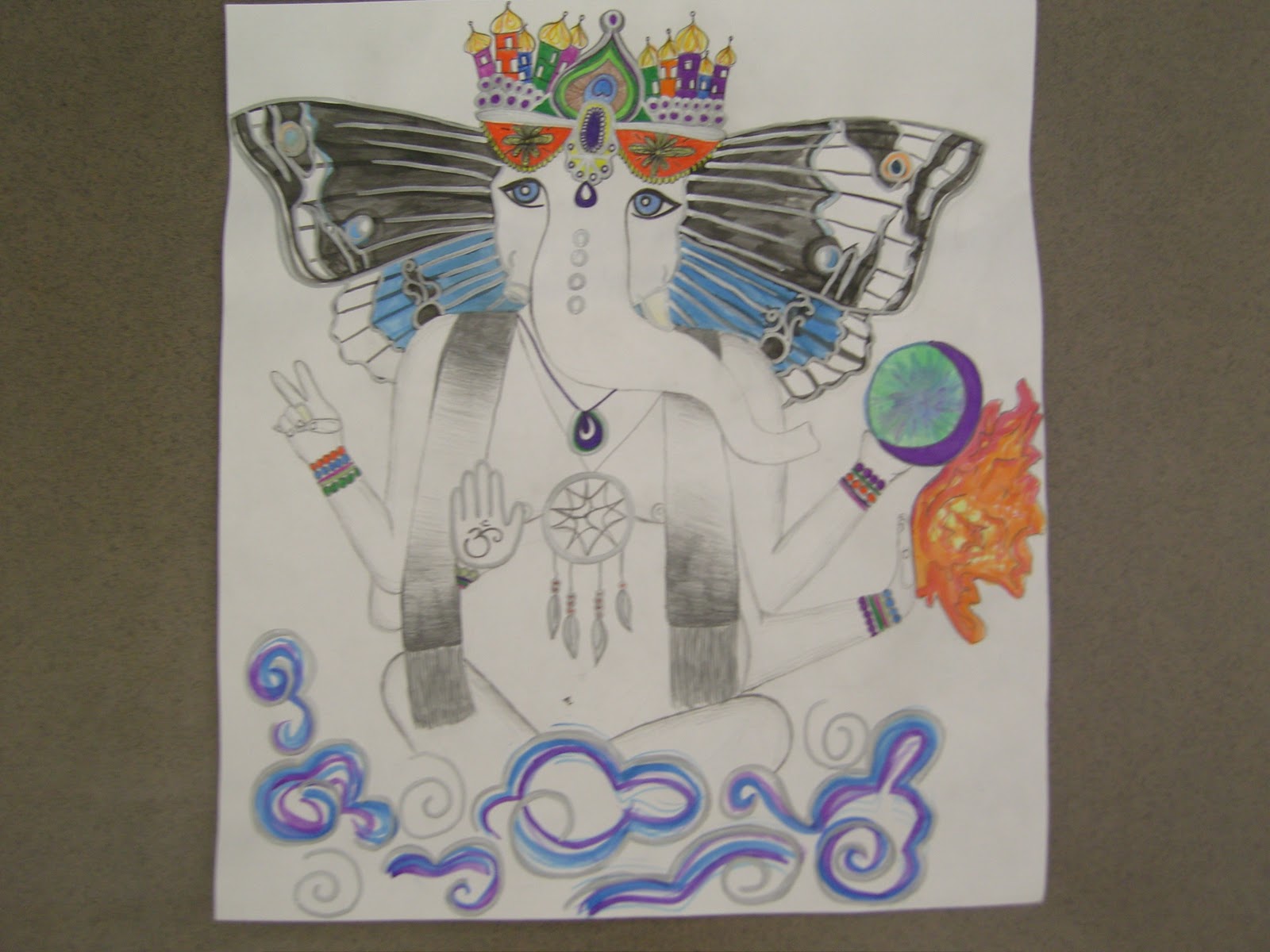 When researching Hindu art I noticed a lot of the modern pieces were done in color pencil and watercolor. My drawing of Ganesha is mostly color pencil with water color in the clouds. The lotus flower is done in all color pencil and was outlined with a metallic marker.